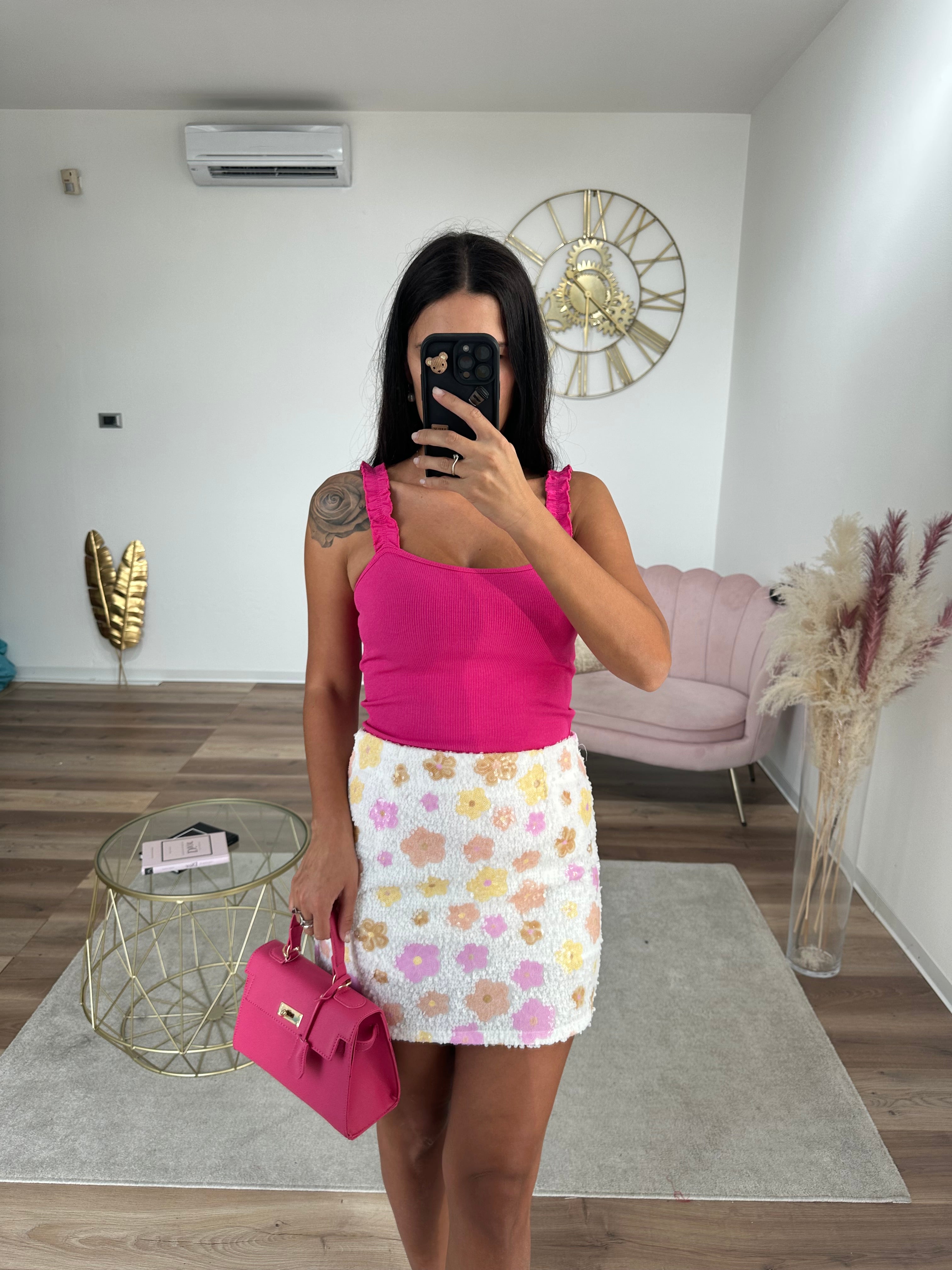 Gonna fantasia floreale ricoperta di paillettes, non è elasticizzata, pantaloncino come sottoveste, chiusura con zip sul retro