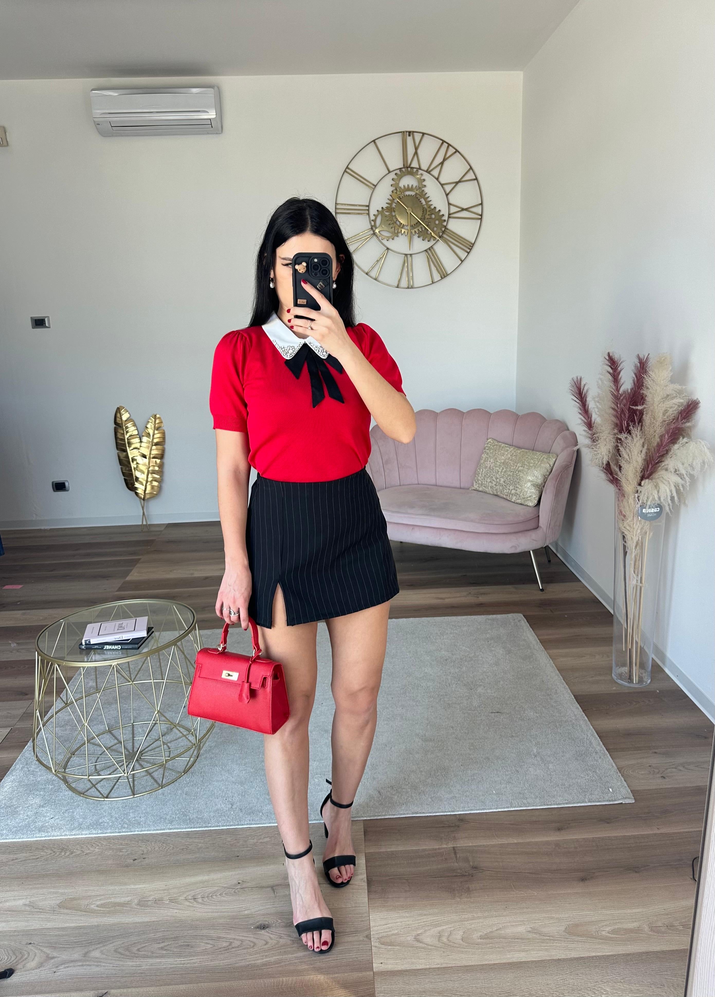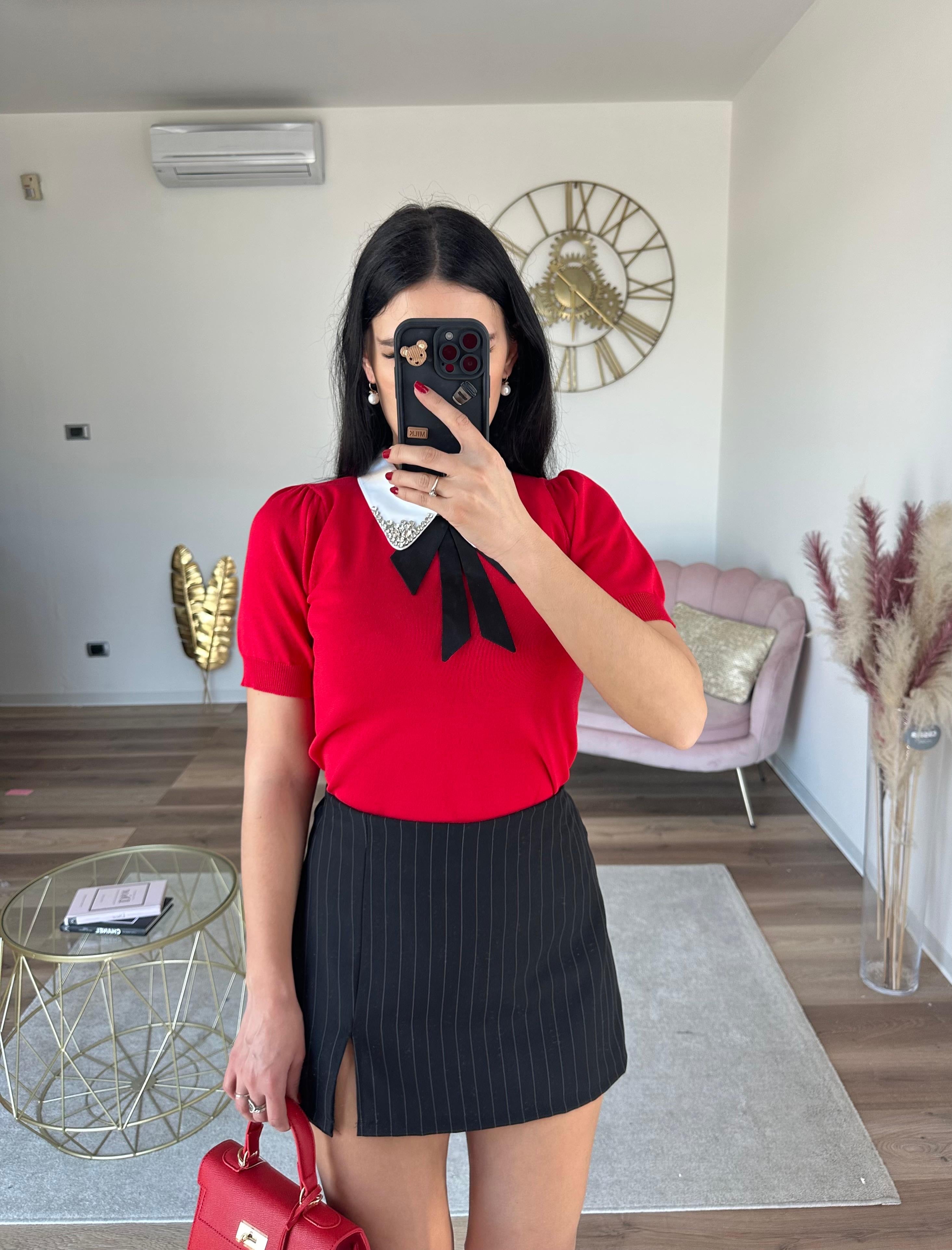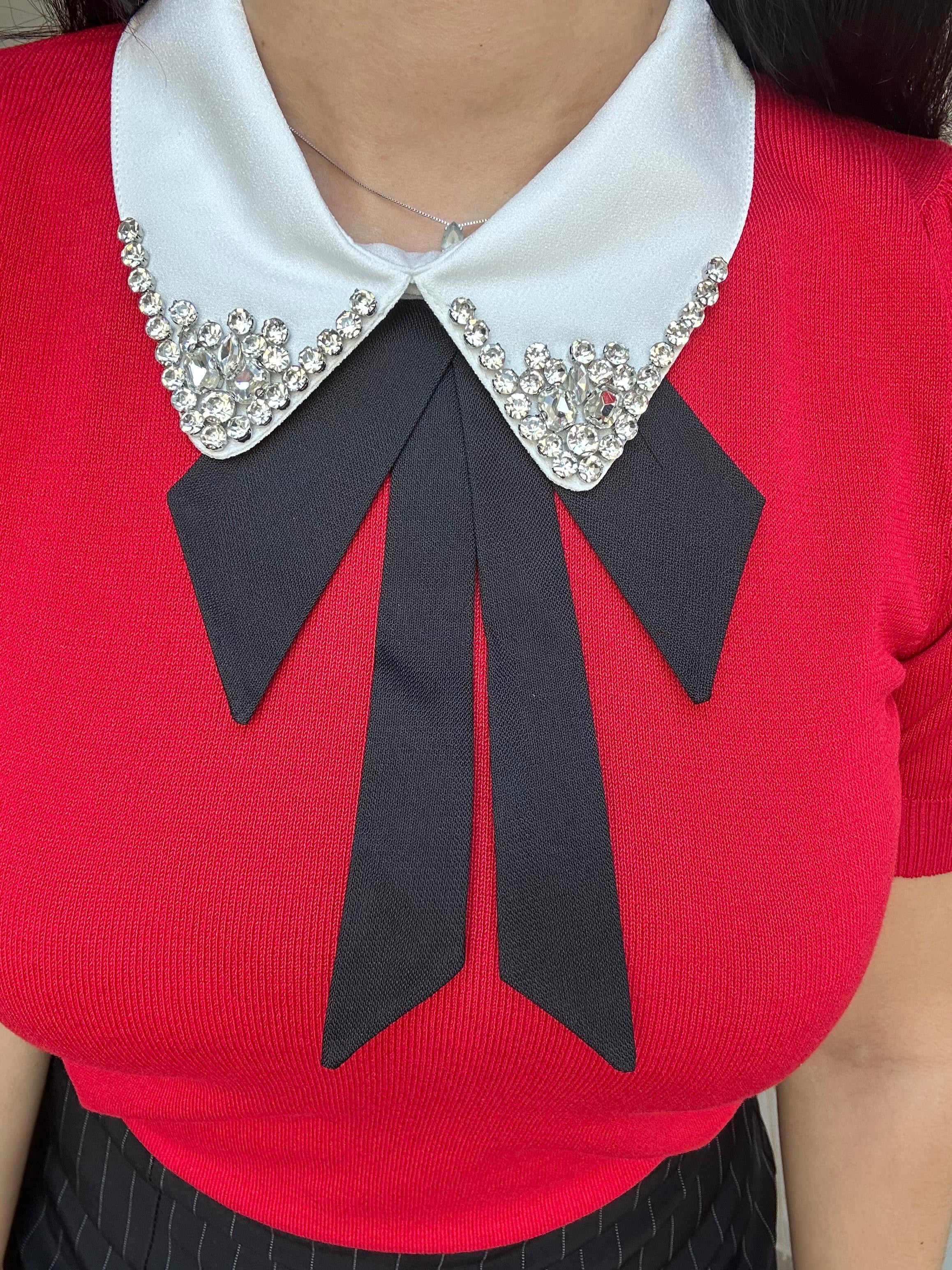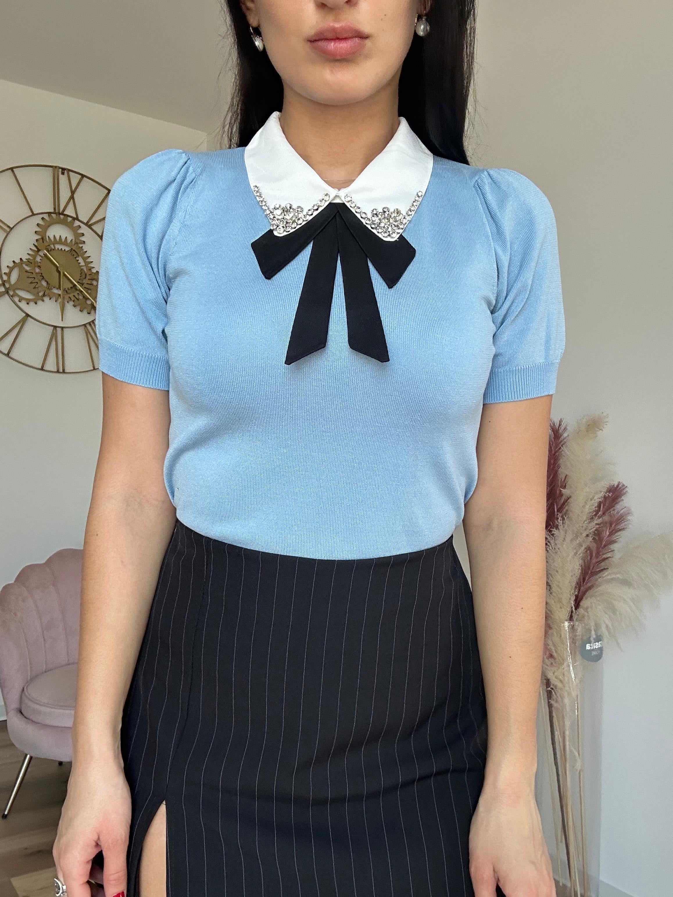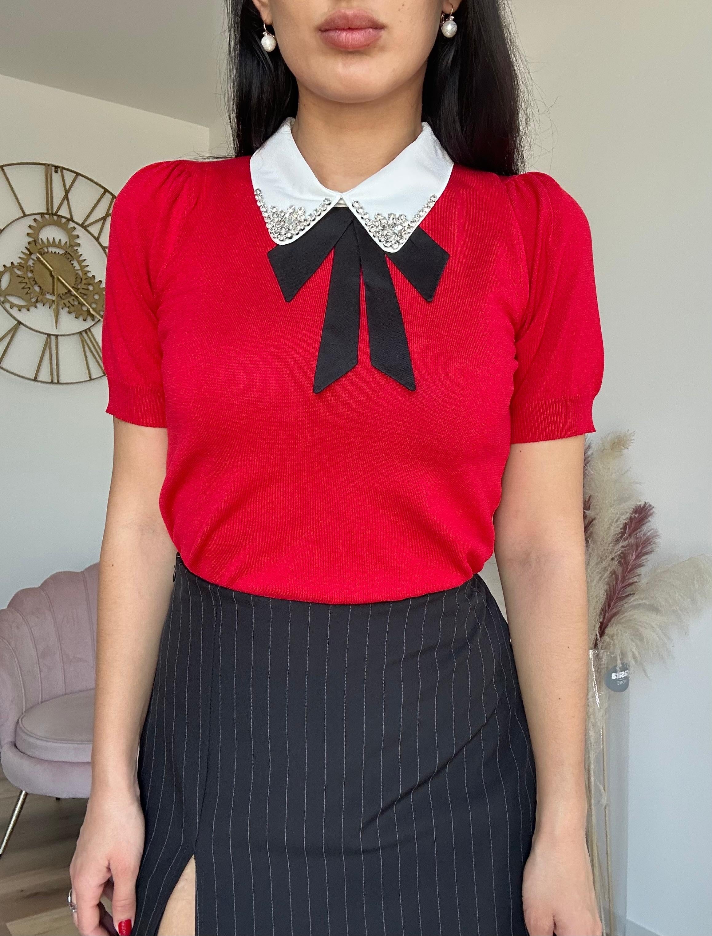 Maglia a maniche corte, elasticizzata, con fiocco e strass.
