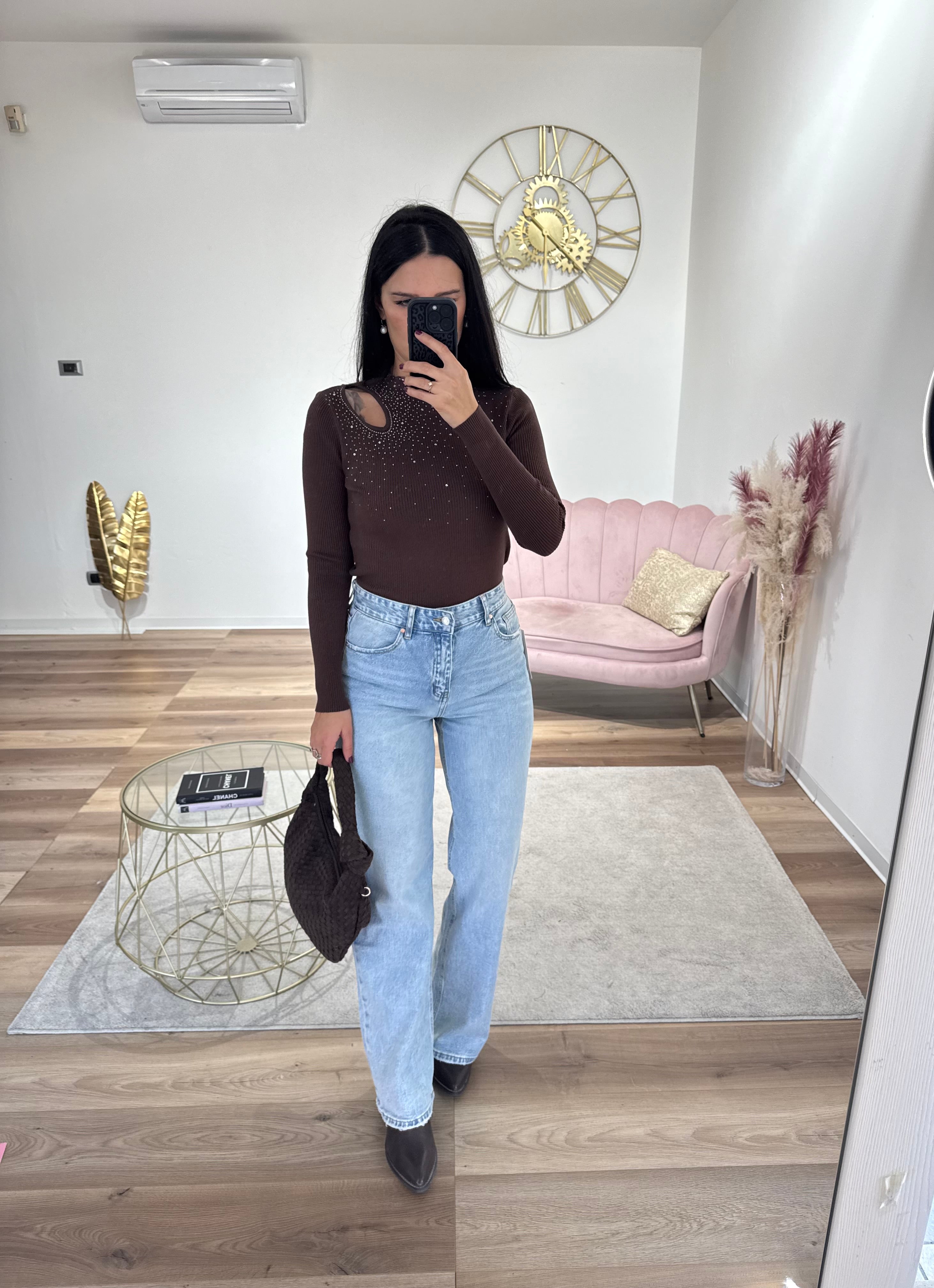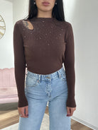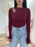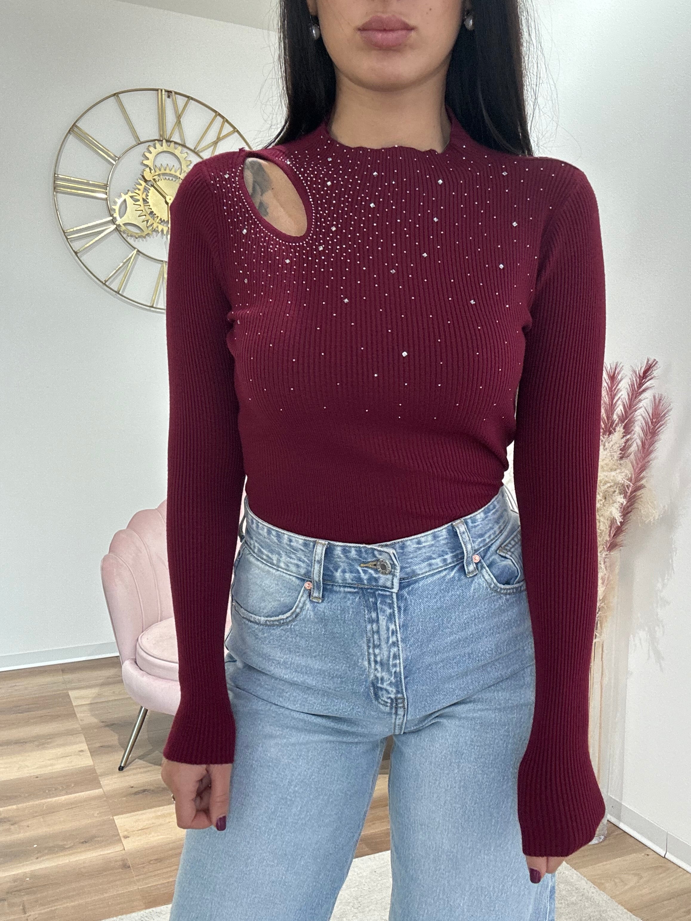 Pull caldo e morbido impreziosito da strass, tessuto a costine, lunghezza normale, elasticizzato