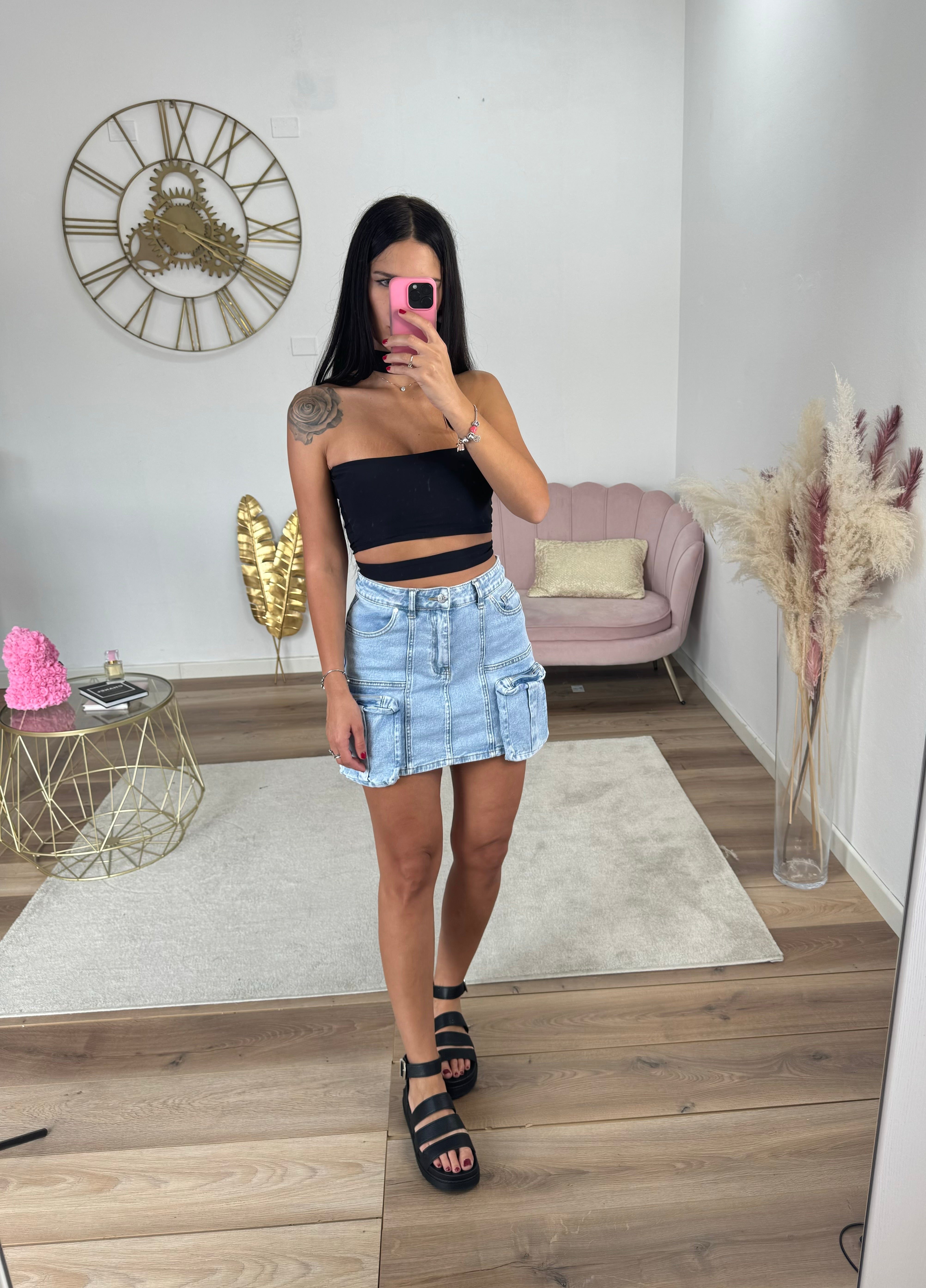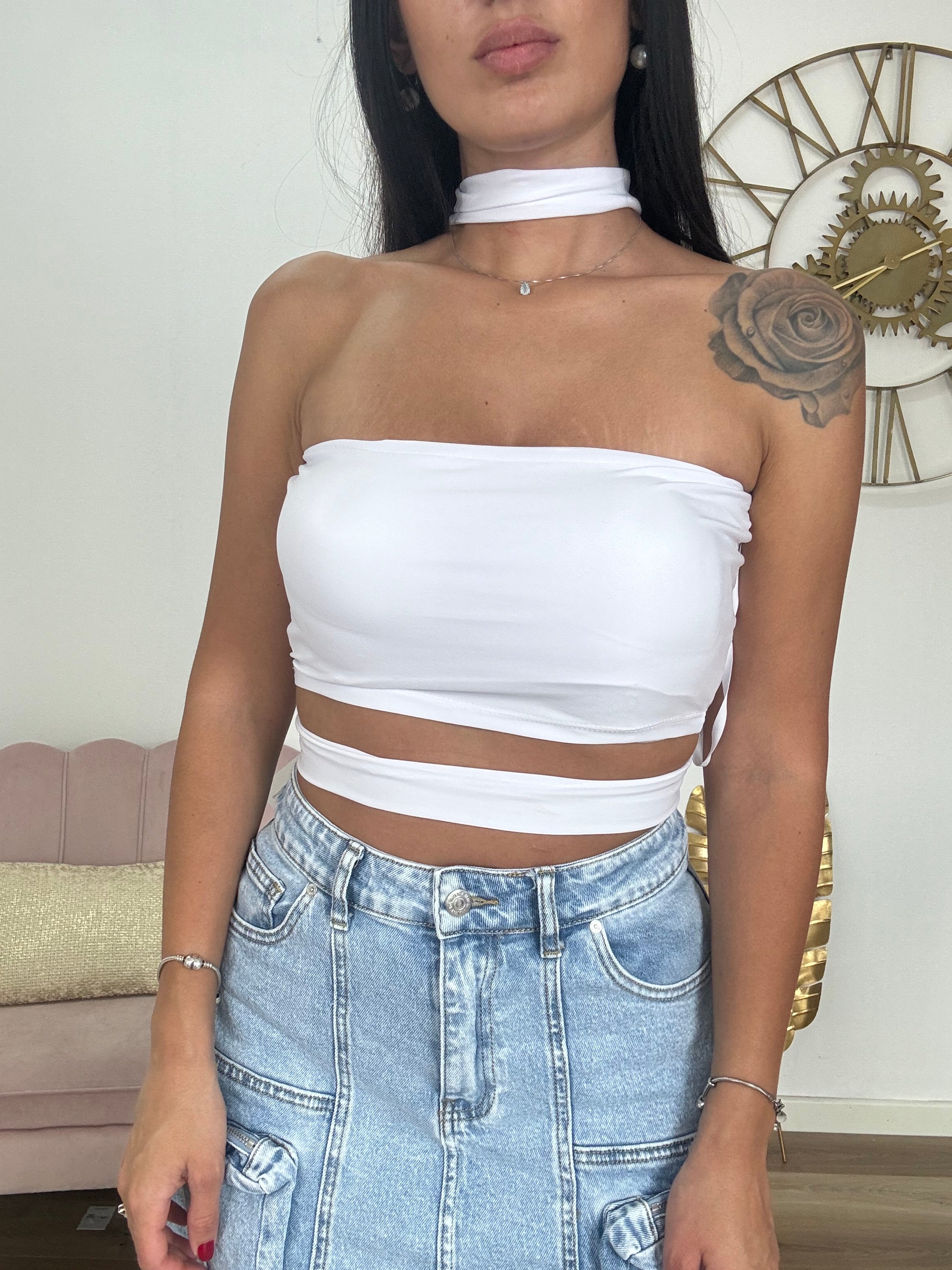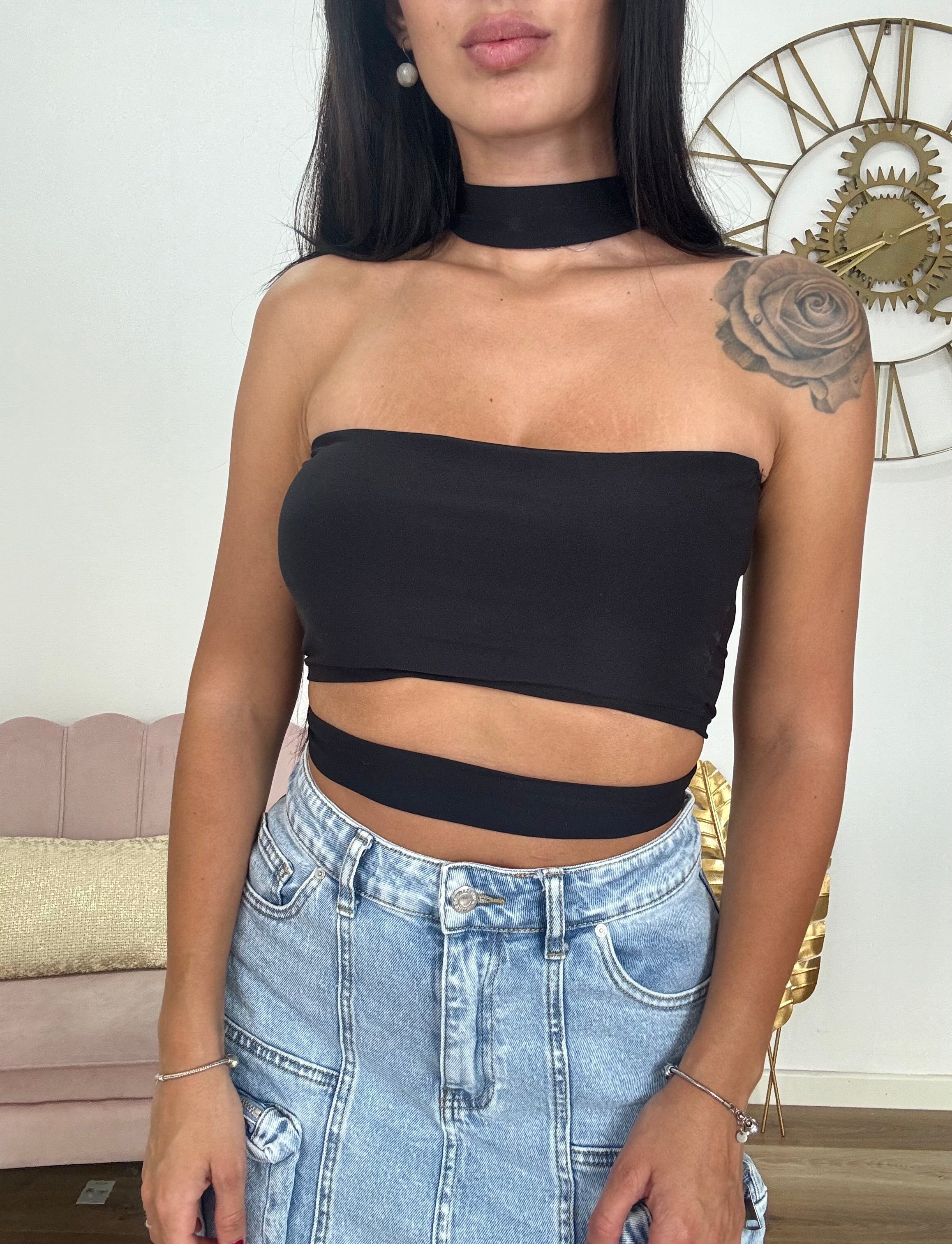 Top modello a fascia, in lycra , elasticizzato, modello Crop e coppe sono preformate.