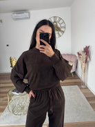 Tuta calda e comoda in ciniglia - pantalone a palazzo con coulisse regolabile ed elastica in vita con tasche - felpa elasticizzata